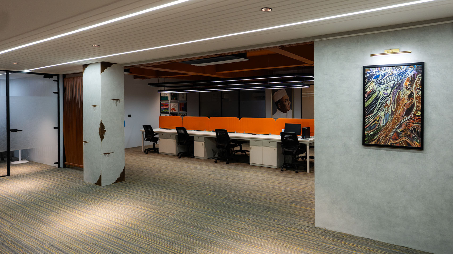 The commercial space area is defined by its soft curves and flowing lines. The design language is subtle, with wave-inspired wall treatments, mellow lighting, and a glowing reception counter that feels sculptural. The palette leans into earth tones—creamy whites, muted golds, and warm greys—creating a meditative, tactile experience. This is a space designed not to shout but to soothe, where every curve and contour is intentional, guiding movement and setting tone.